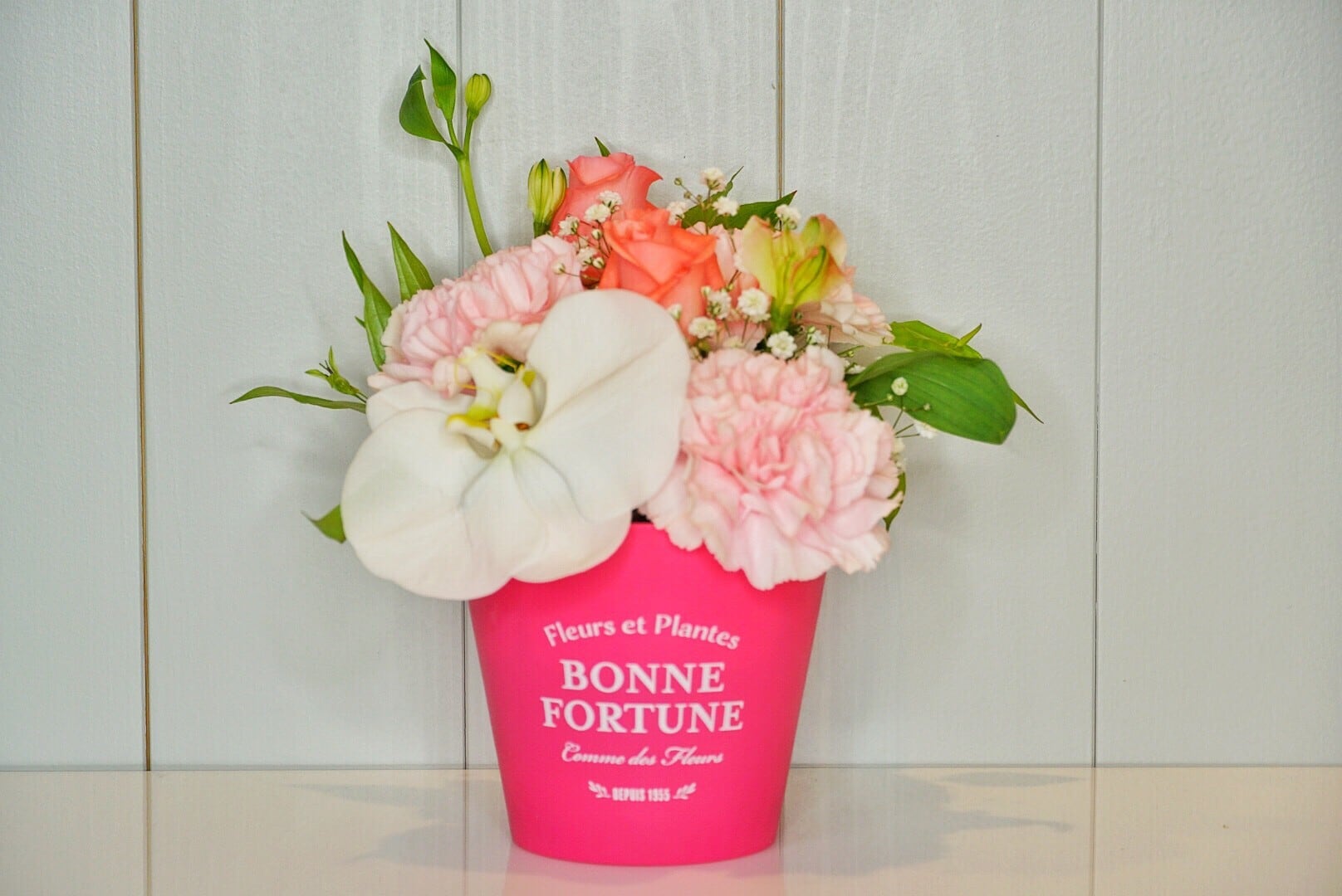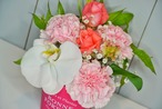 PINKのカーネーションを使ったアレンジに胡蝶蘭を入れて華やかに仕上げました。 胡蝶蘭の花言葉『幸福が飛んでくる』 あなたのもとに幸福が舞い込みますように。 〇手作りマスクを1つお付け致します。 〇メッセージカードが必要な方は、備考欄に入力お願いします。