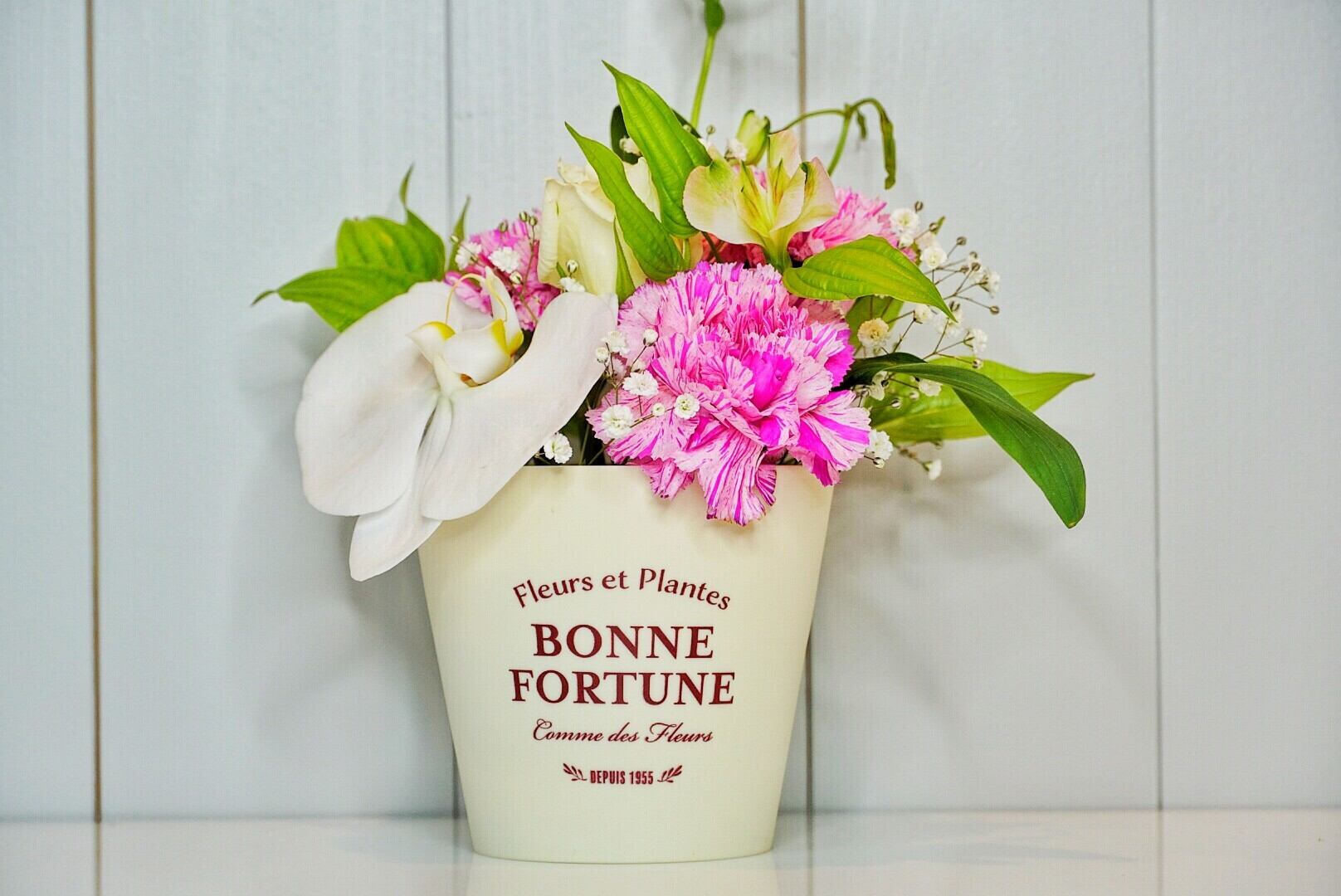 PURPLEのカーネーションを使ったアレンジに胡蝶蘭を入れて華やかに仕上げました。 胡蝶蘭の花言葉『幸福が飛んでくる』 あな たのもとに幸福が舞い込みますように。 〇手作りマスクを1つお付け致します。 〇メッセージカードが必要な方は、備考欄に入力お願いしま