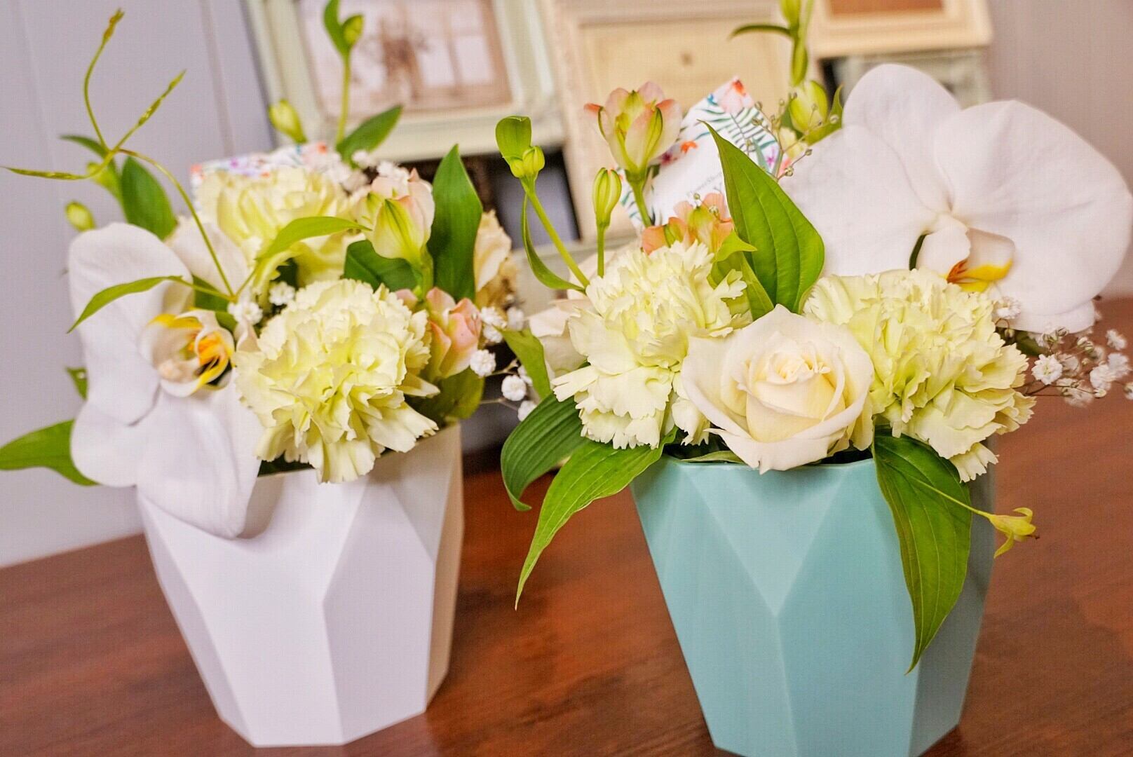 GREENのカーネーションを使ったアレンジに胡蝶蘭を入れて華やかに仕上げました。 胡蝶蘭の花言葉『幸福が飛んでくる』 あなたのもとに幸福が舞い込みますように。 〇手作りマスクを1つお付け致します。 〇メッセージカードが必要な方は、備考欄に入力お願いします。