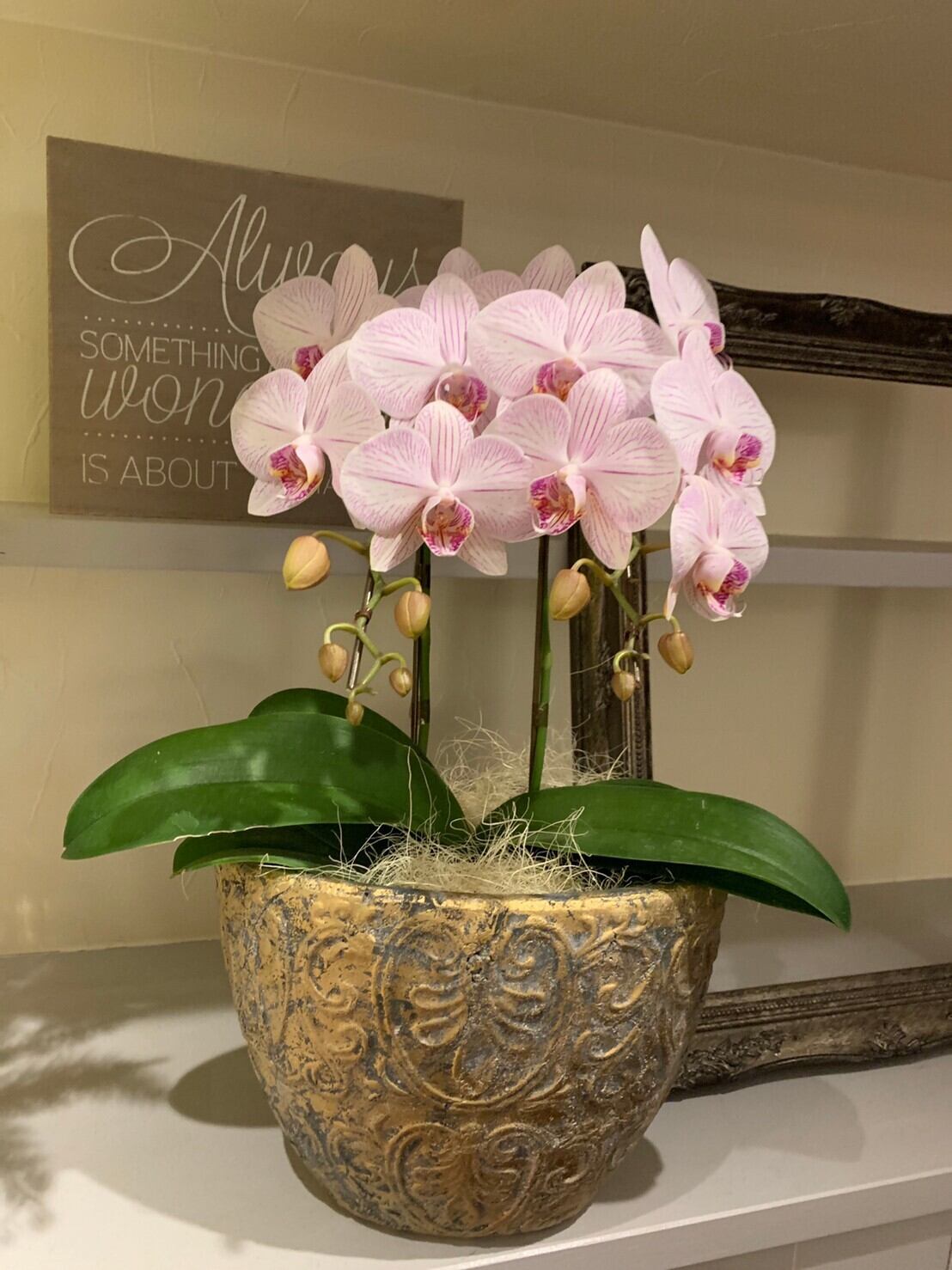 『幸福が飛んでくる』を花言葉に持つ胡蝶蘭 ピンクのミディ系胡蝶蘭をモダンな陶器に合わせました。 上品な見た目で贈り物にもぴったりです。 〇手作りマスクを1つお付け致します。 〇メッセージカードが必要な方は、備考欄に入力お願いします。