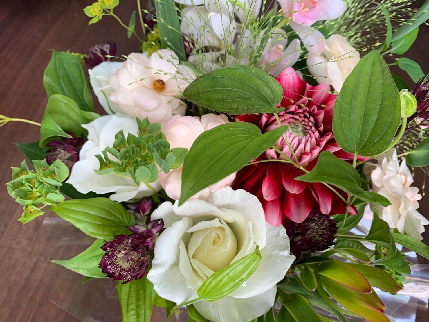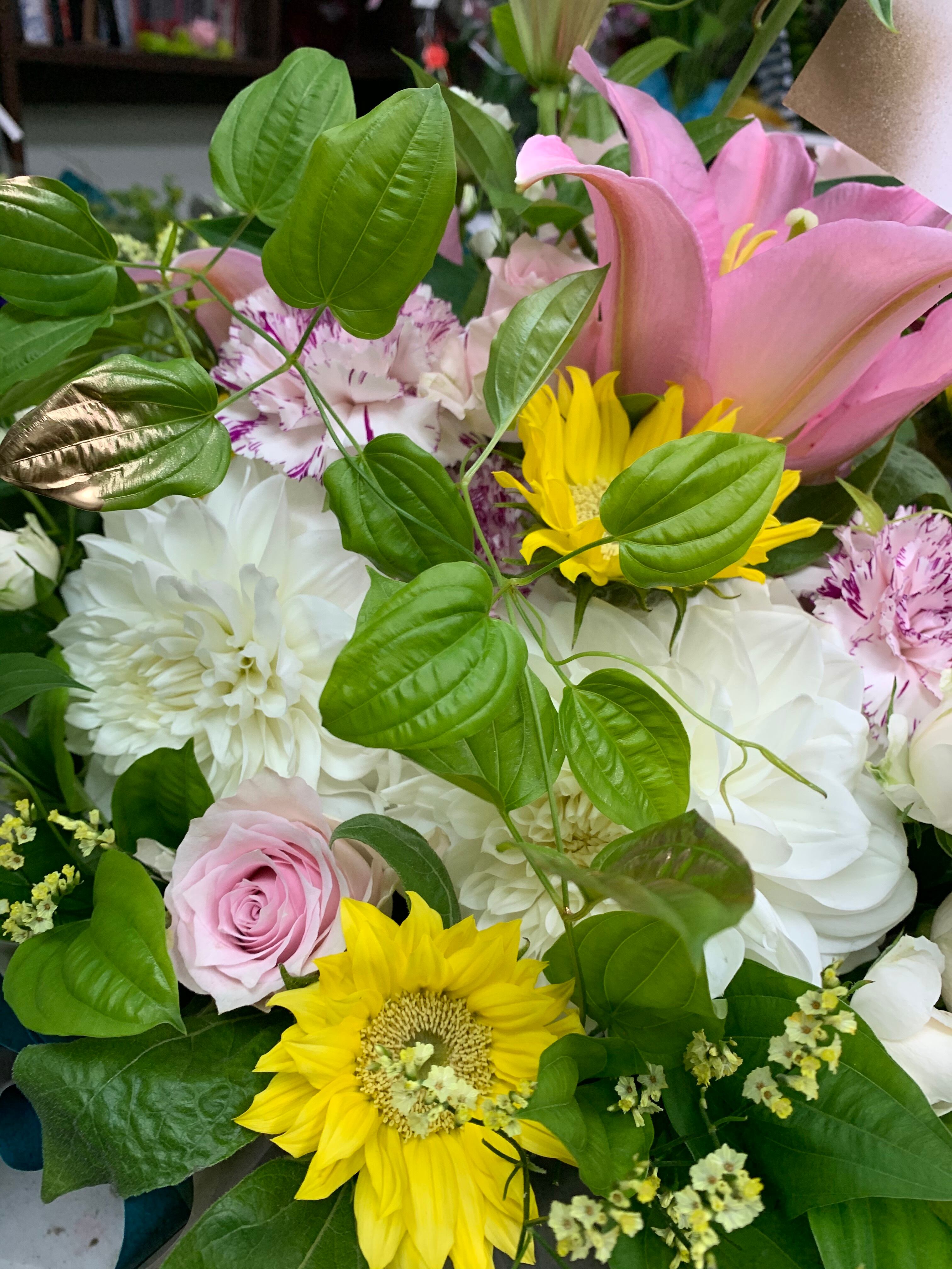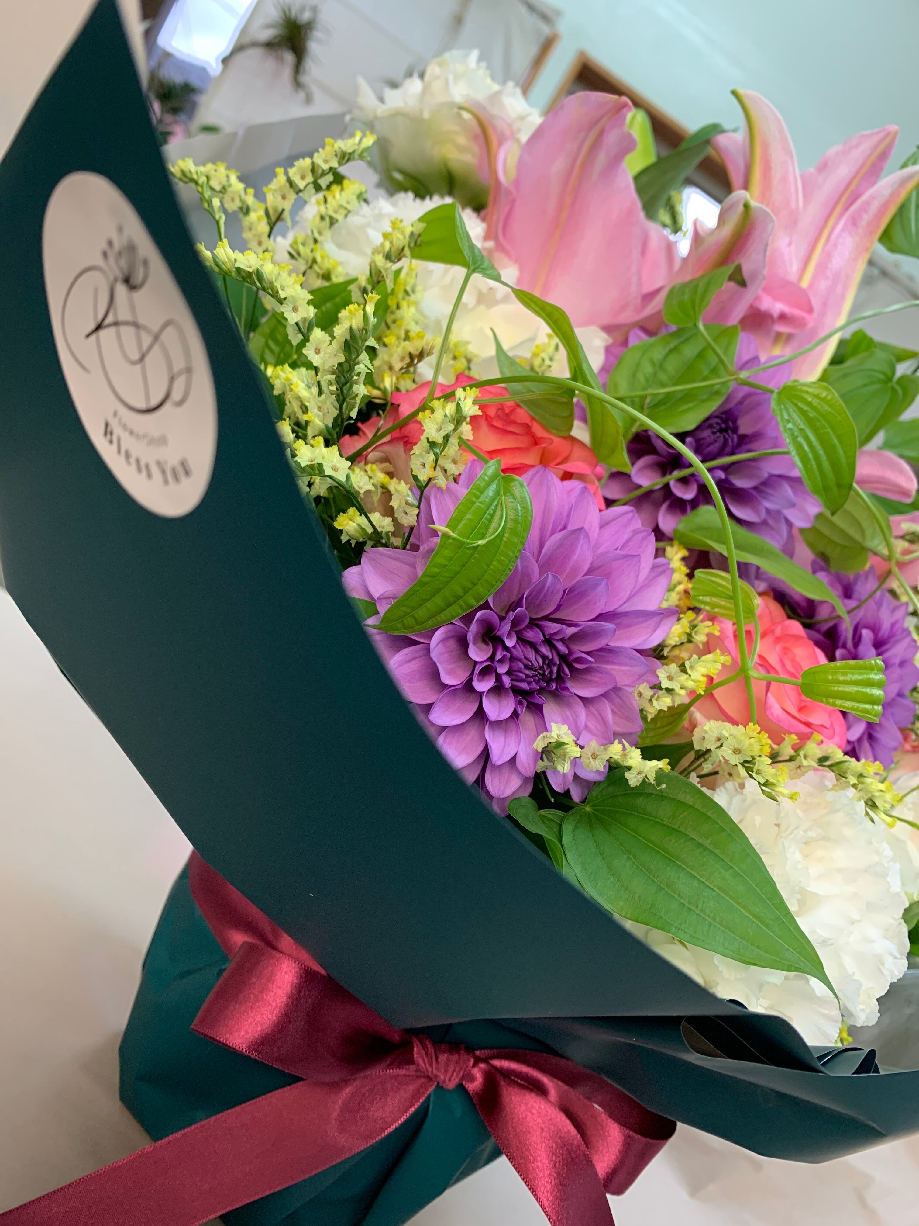 お花、お色味すべておまかせで華やかなアレンジをお作りします。 ボリューム感があり御祝、贈り物にぴったりです! ※写真はイメージです。 〇メッセージカードが必要な方は、備考欄に入力お願いします。
