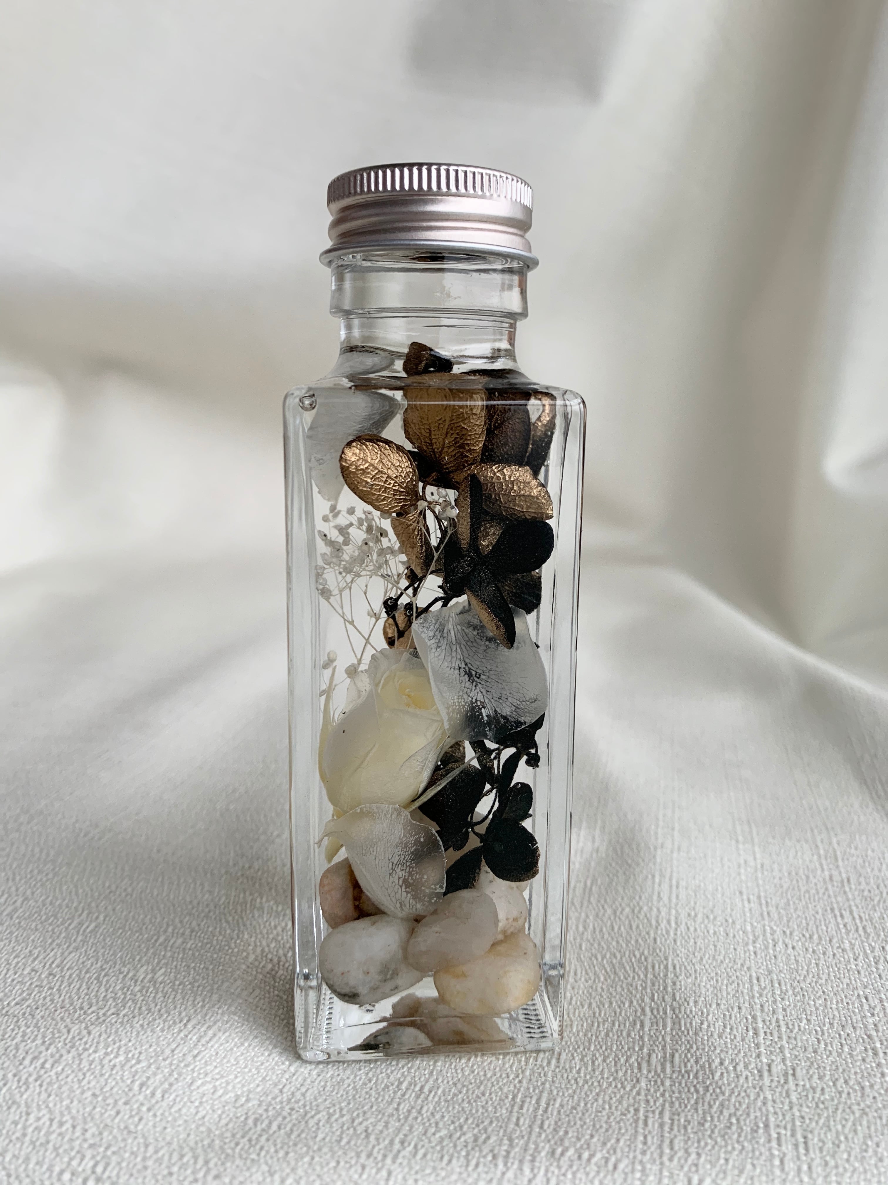 小石やゴールドの紫陽花、の中に白い薔薇を使って上品で落ち着いた色合いに仕上げました。 デスクの上や窓辺、小棚にあるだけでホッと心が和みます。 高さ13㎝、幅奥行き4.5㎝ ○宮崎市内にあるロッサコーヒーさんのドリックパックが2パック付きます。封をあけた瞬間、幸せな香りに包まれますよ^_^ 〇手作りマスクを1つお付け致します。 〇メッセージカードが必要な方は、備考欄に入力お願いします。